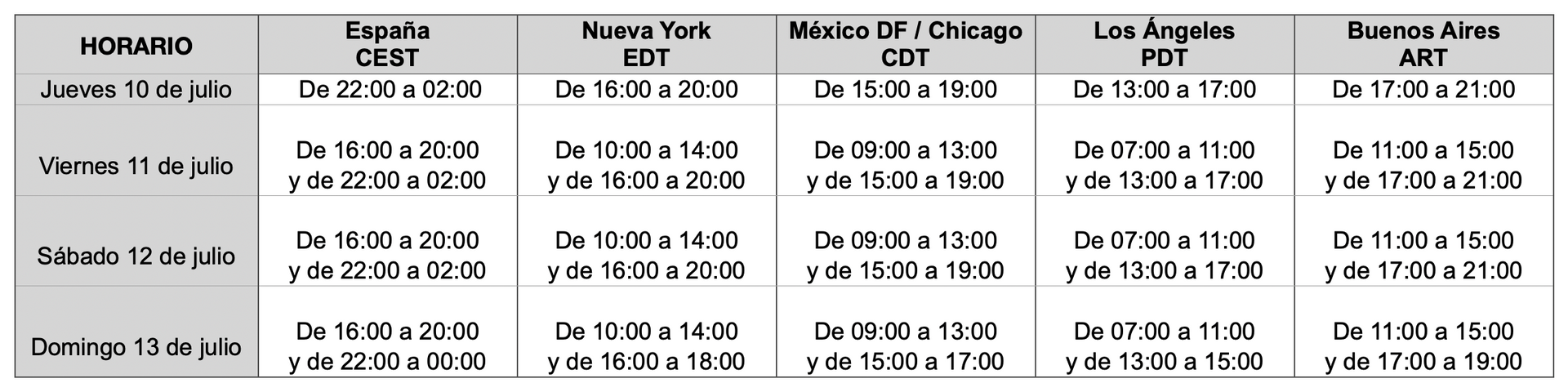 - Domingo 13 de julio, de 16:00 a 20:00h y de 22:00 a 00:00h
